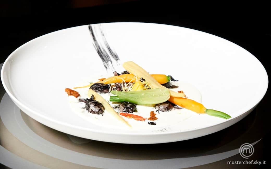 Servire in una fondina con sotto un mestolino di crema, le seppioline scottate, mezza verdurina per seppiolina, una spolverata di crumble, germogli per decorare e una spennellata al nero di seppia nel piatto. Aggiungere per ogni piatto un riccio di mare e 2 cucchiai di caviale.