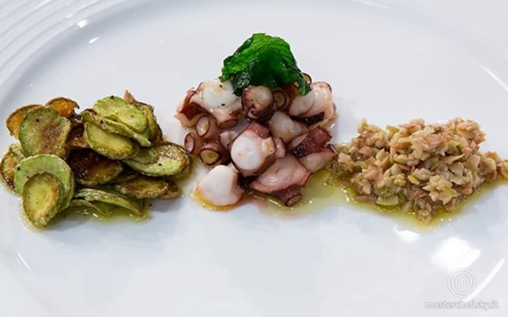 Impiattare le zucchine privandole dell’aglio insieme al polpo al centro del piatto e affiancarvi il trito di olive. Prendere il condimento delle zucchine e con l'aiuto di un cucchiaio versarne un po’ sul polpo. Completare il piatto decorando il polpo con le foglie di menta fritte.