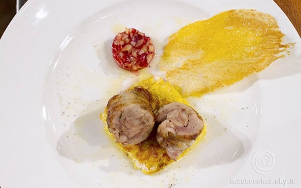 Coppare il flan in quattro e posizionare un quadrato su ogni piatto. Sopra porvi l’arrosto di quaglia tagliato a metà, a fianco un cucchiaio di ciliegie marinate e una chip di mais. Regolare di sale, pepe e olio.