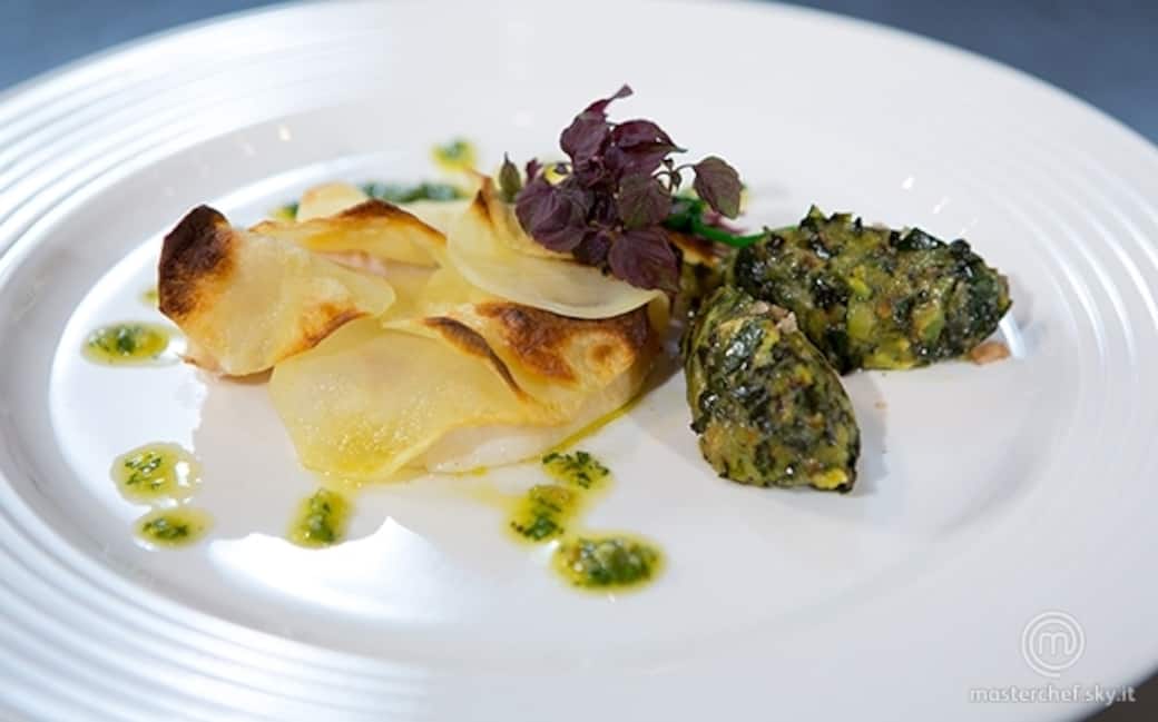 Sfornare il filetto di San Pietro. Impattare collocando i filetti di San Pietro al centro del piatto, accompagnare con quenelle di zucchine, guarnire con pesto e un bouquet di germogli ed erba cipollina.