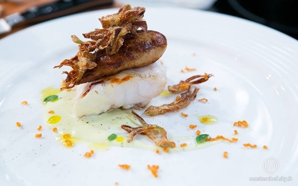 In una fondina a tesa larga adagiare il trancio di scorfano posandolo sul piatto dalla parte della polpa, condirlo con qualche fiocco di sale, una macinata di pepe fresco e un filo di olio evo. Adagiare sopra di esso il fegato cotto, anch'esso condito con sale e pepe, e versare la salsa di porro sul fondo della fondina. Infine ultimare il piatto guarnendo il tutto con un ciuffo di porro fritto. Servire caldo.
