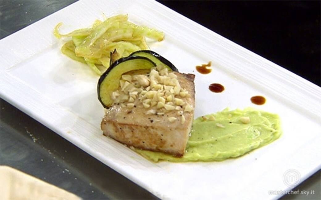 Trancio di spada alle mandorle tostate con salsa guacamole e insalata di finocchio al balsamico