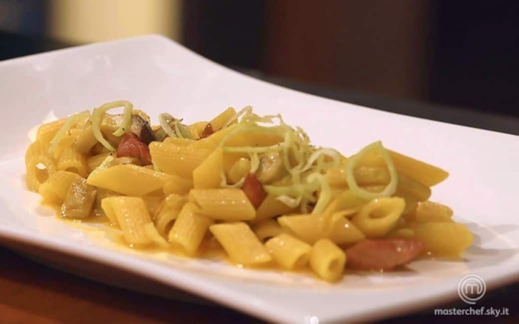 Disporre le mezze penne in un piatto e guarnirle con le rondelle di porro.