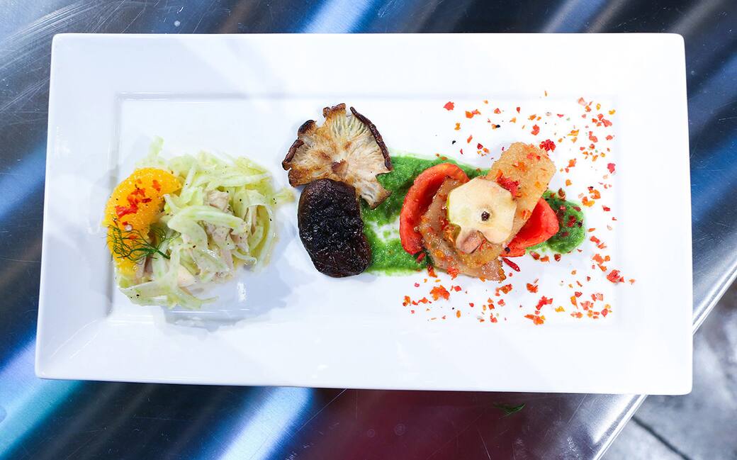 In un lato del piatto adagiare l'insalata di finocchio, arancia e trippa. Dall'altra parte versare una virgola di crema di insalata, due fette di pomodoro seccate in forno, due pezzetti di trippa glassata al miele condita con le bucce di pomodoro tritate e una fettina di mela secca in cima. Al centro aggiungere le cime di due funghi shiitake saltati in padella.