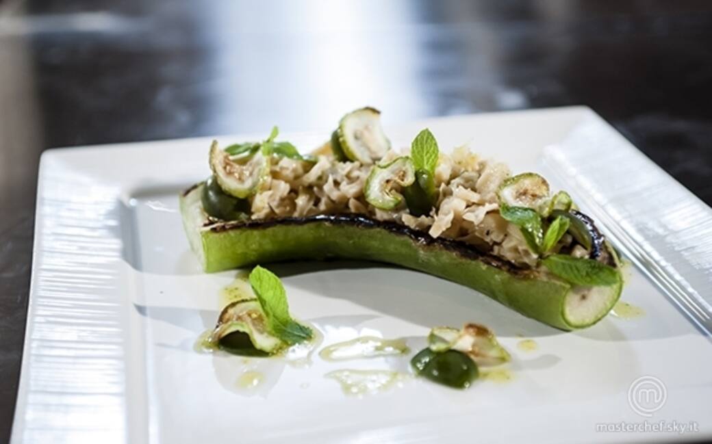Farcire la zucchina con la trippa, un filo di olio e due gocce di aceto. Condire la zucchina ripiena con un filo di vineagre e impiattare. Decorare con zucchine fritte, olive e le foglie di menta.