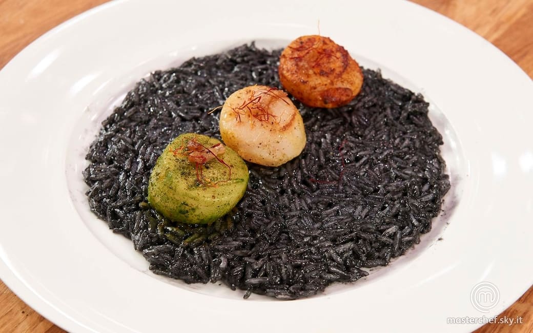 Impiattare disponendo un letto di riso al nero di seppia e adagiando 3 capesante, una di ogni colore. Decorare con i pistilli di zafferano e aggiustare di sale e pepe.