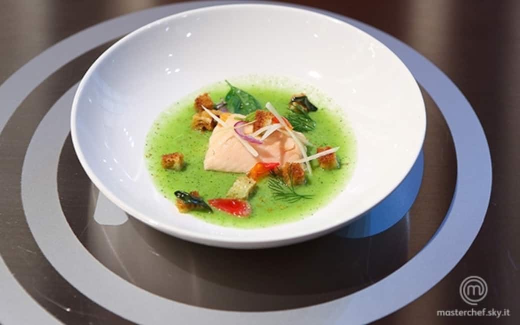 In un piatto fondo adagiare la salsa di cetriolo, posizionare sopra il trancio di trota, decorare con la buccia di pomodoro croccante, i quadretti di mollica saltata, la cipolla marinata, il basilico, il cetriolo a julienne, alcuni fiori di lavanda e una spolverata di elicriso.