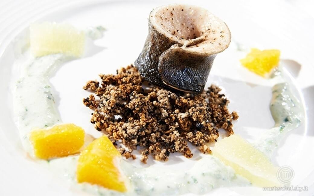 Togliere la trota dal fuoco e metterla su un piatto con carta assorbente. Sfornare il pane e lasciarlo intiepidire. Trasferire la salsa allo yogurt dentro un biberon. Impiattare disponendo l’involtino sulla panure e decorare con la salsa allo yogurt e gli agrumi pelati a vivo.