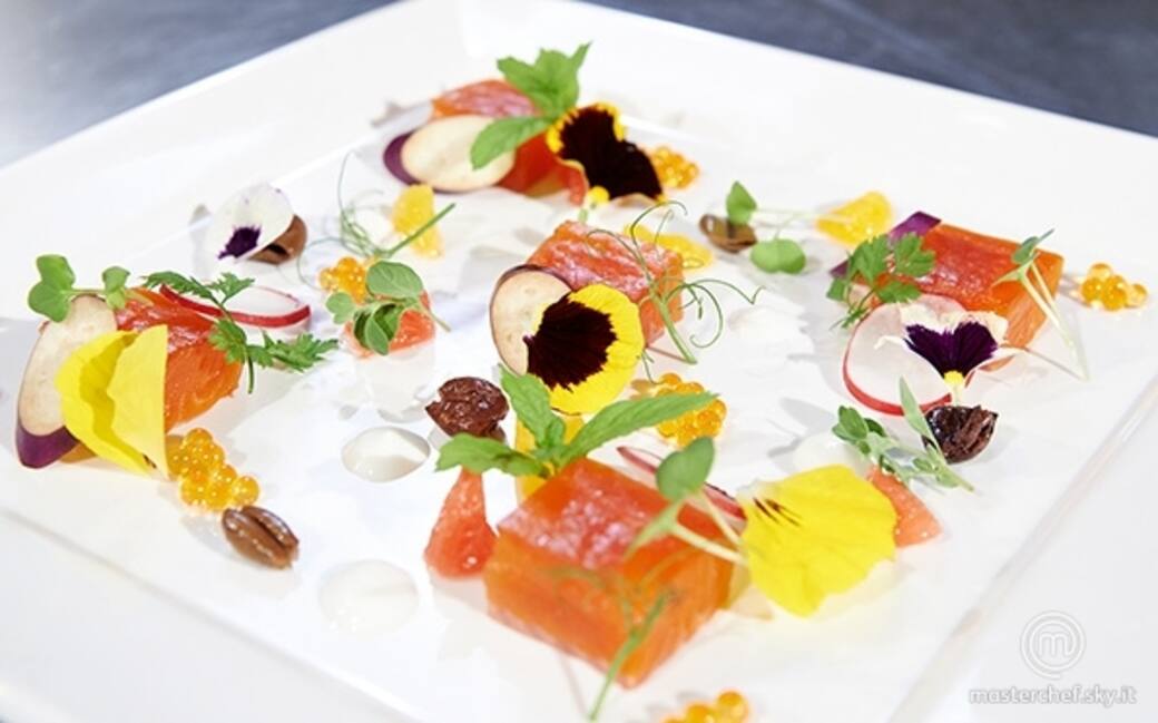 Disporre i cubi di trota, le fetta di arancia e di pompelmo, e alcune gocce di yogurt. Appoggiare su un lato di 4 cubi una fettina di rapanello. Disporre in sei punti del piatto mezzo cucchiaino da caffè di uova di trota. Decorare con le olive precedentemente ammaccate con le mani, le melanzane perline, i fiori, i germogli di pisello e le erbe aromatiche (cerfoglio, aneto, maggiorana, sakura).