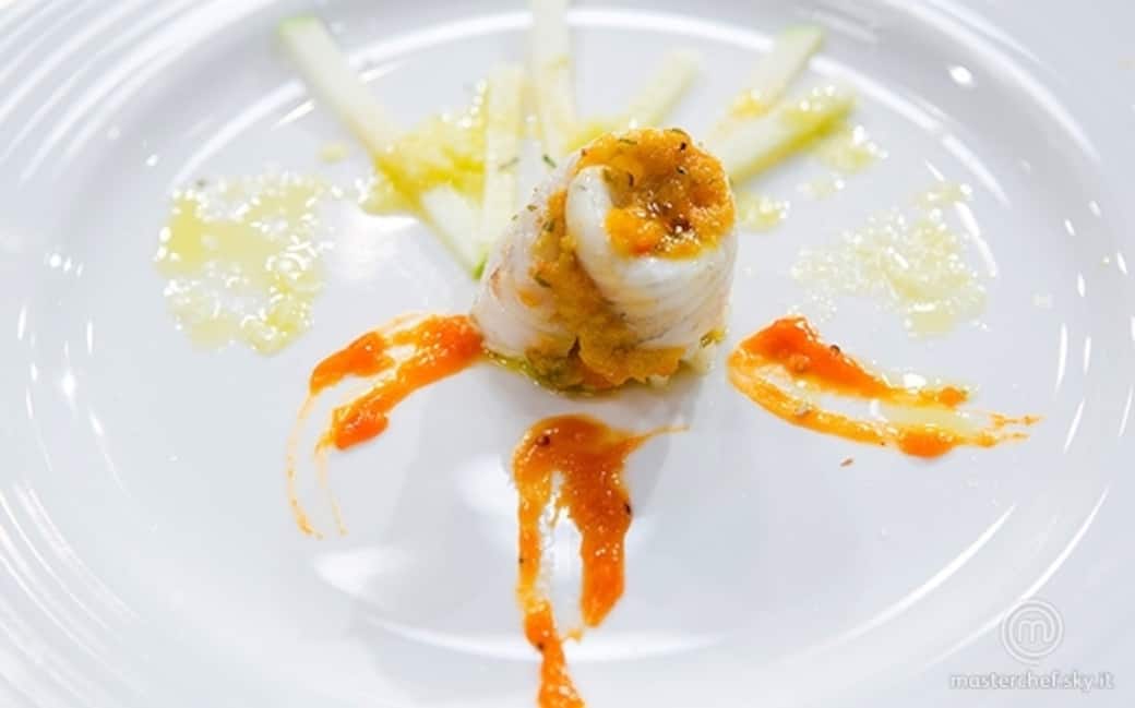 Riempire i filetti di rombo con il composto, arrotolare e nascondere un cappero dissalato all'interno. Legare i turbanti con filo da cucina e infornare 10-12 minuti a 200 gradi con un filo di olio.