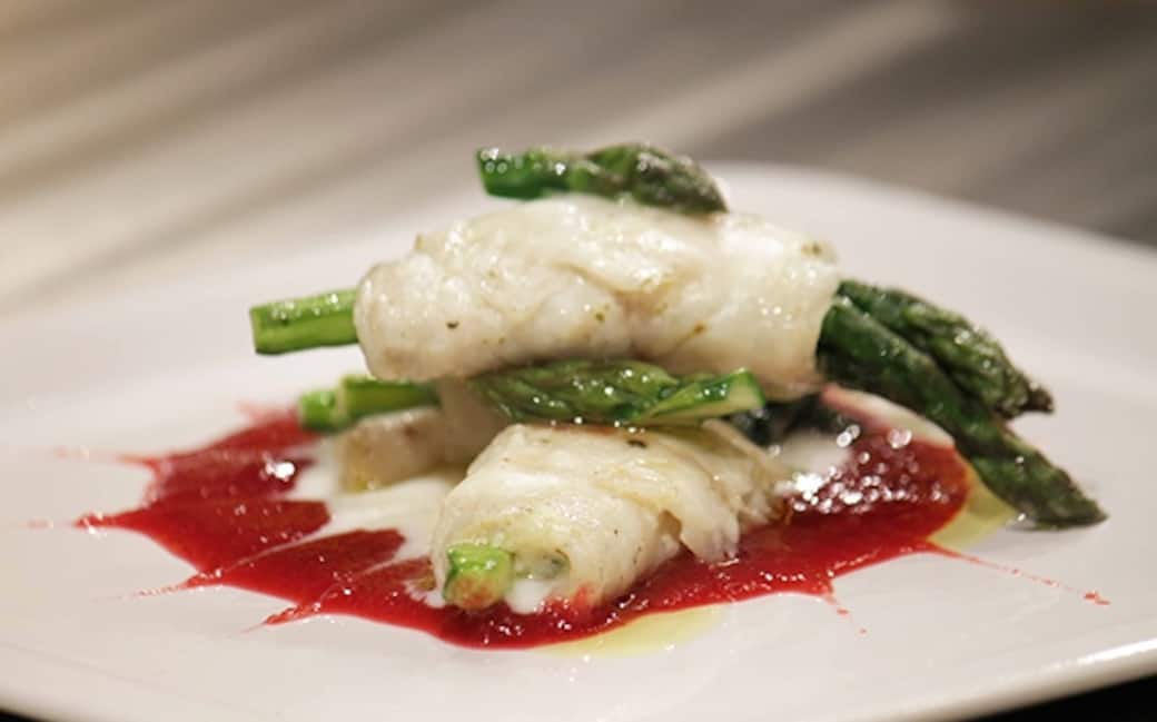 Prendere i filetti di branzino e schiacciarli facendo un carpaccio, condire con olio, sale e pepe. Pulire con un pelapatate il gambo degli asparagi, e cuocerli a vapore per 10 minuti. Condire con sale e olio e avvolgerli nel branzino.