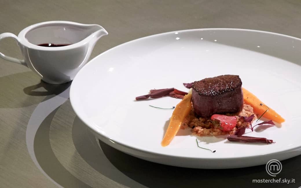 Impiattare coppando il crumble di pane al centro del piatto. Adagiare il medaglione sopra e aggiungere le carote tornite, le fragole, qualche scaglia di cioccolato e germogli per decorare. Aggiustare di sale e pepe. Versare la riduzione in un brick e versare sul controfiletto prima di servire.