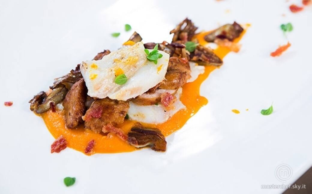 Sciacquare sotto acqua corrente il baccalà per rimuovere completamente il sale. Asciugare con un panno e marinare con il succo di un'arancia, uno spicchio di aglio schiacciato e dieci foglie di maggiorana sminuzzate. Pepare.