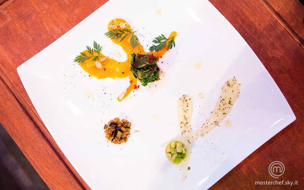Adagiare su un lato dei piatti la vellutata di zucca e carota in abbinamento alle cime di rapa, spolverando con poca paprika affumicata. Distribuire sull'altro lato la vellutata di patate con la dadolata di avocado e friggitelli, spolverando con l’origano. Posizionare al centro le melanzane con l’aiuto di un coppapasta. Completare con un filo d’olio e un pizzico di pepe, guarnendo con i ciuffi verde della carota e i semi della zucca.