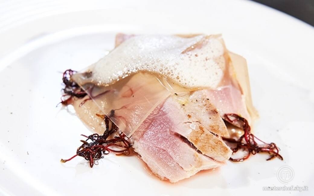 Prendere una padella e scottare il tonno marinato da entrambi i lati. Impiattare con la crema di castagne, il tonno scottato, l’aria di tè, la gelatina di whiskey e i germogli di barbabietola.