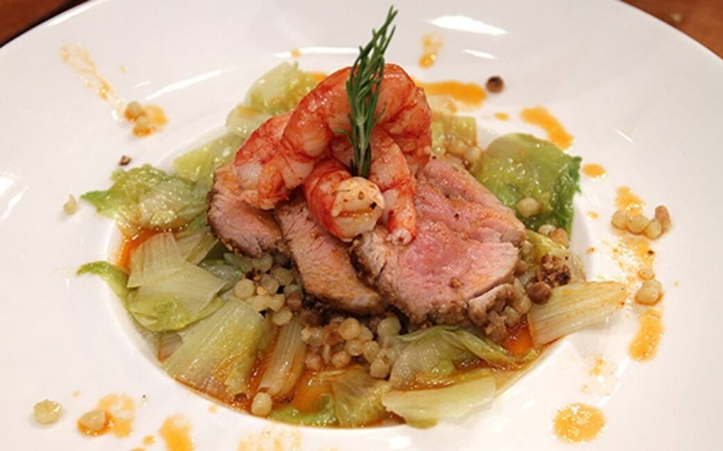 Assemblare il piatto con la scarola alla base, adagiarvi sopra la fregola, il vitello scaloppato e per ultimi i gamberi. Irrorare il tutto con la bisque all’arancia che raccorderà i sapori.