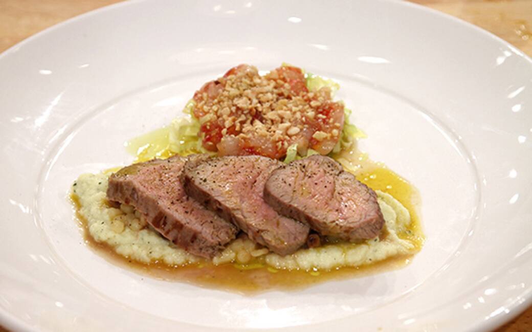 Tagliare il filetto sulla purea di sedano rapa e napparlo col suo fondo. Tagliare la scarola finemente e adagiarvi sopra la tartare di gamberi.