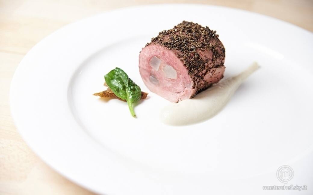 Pulire il vitello e tenere da parte gli scarti. Aprirlo con il coltello e batterlo su carta velina da macellaio. Tritare timo e rosmarino. Farcire il vitello con i bastoncini di lardo di colonnata, trito di erbe, sale, scarti di vitello, pepe in grani. Arrotolare il filetto di vitello sulla carta da macellaio creando un salame e con la pellicola trasparente creare una caramella. Mettere sottovuoto. Infornare il vitello sottovuoto su una teglia. Forno impostato a 100% vapore a 70°C per 40 minuti.