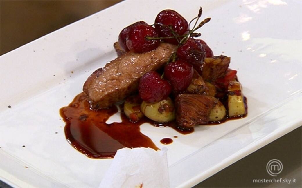 Impiattare le patate e i peperoni, adagiare il vitello e la salsa alle ciliegie.