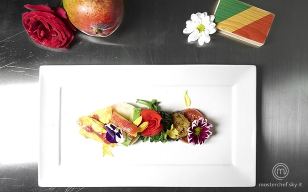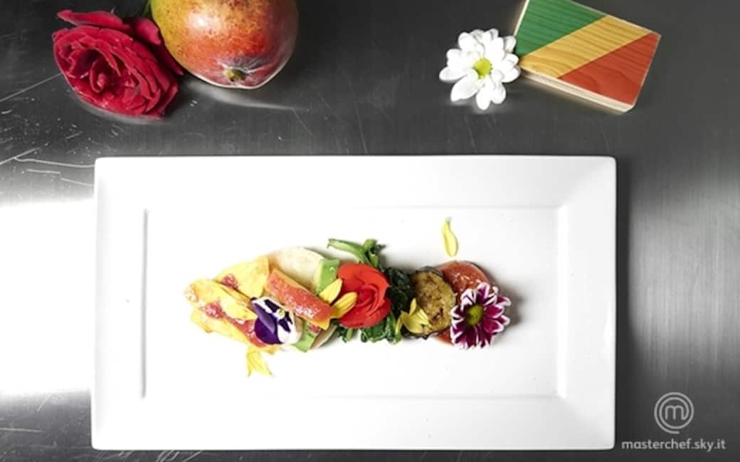 Montare il piatto alternando gli ingredienti cotti, la frutta fresca e la manioca. Condire con un filo d'olio evo, sale, pepe macinato e un velo di cocco in polvere. Decorare con fiori eduli.
