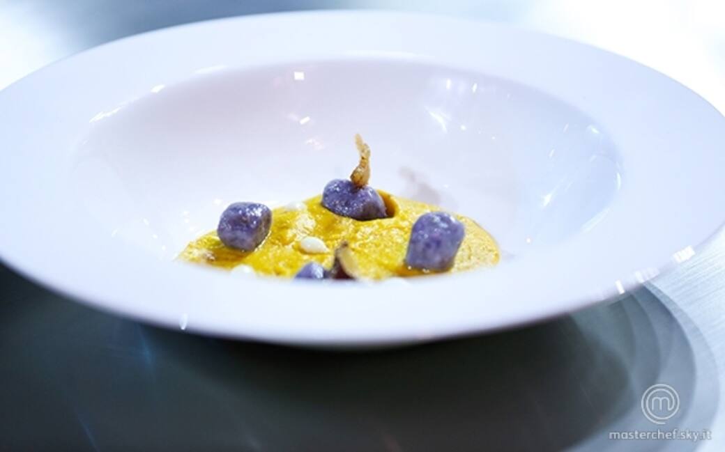 Adagiare alla base del piatto la crema di zucca, adagiarvi sopra gli gnocchi e guarnire con la fonduta e il guanciale croccante. (qualche fiore o foglia di basilico non guasta mai)