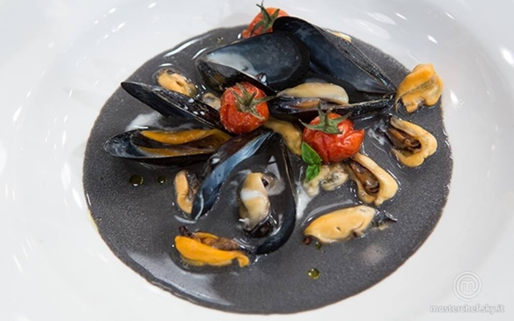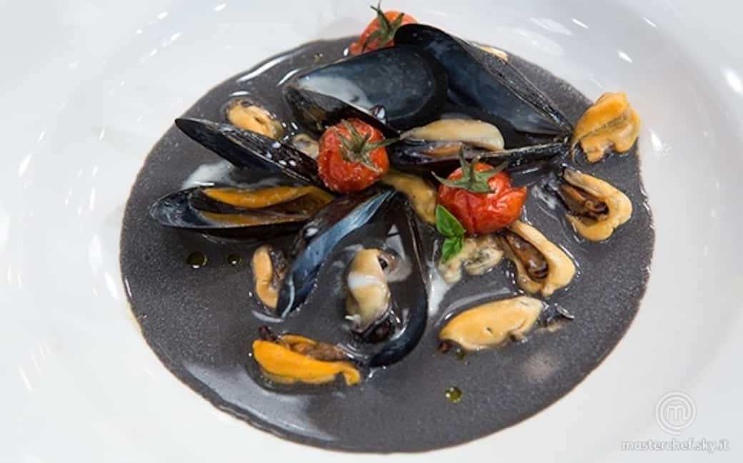 In una padella ben calda scaldare un filo di olio di oliva extravergine con uno spicchio d'aglio in camicia, versarvi le cozze e farle aprire a fuoco vivo, appena le cozze saranno leggermente aperte e avranno rilasciato tutta la loro acqua aggiungere due cucchiaiate di nero di seppia e la spremitura della mozzarella e lasciar cuocere per altri 5 minuti, dopo di che prelevare le cozze e riporle in un contenitore, togliere lo spicchio d'aglio in camicia e ridurre la salsa aggiustandola di sale e di pepe fino a corretta colorazione e giusta sapidità.