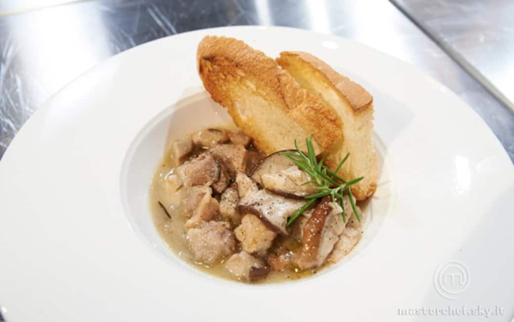 Disossare il pollo e ottenere dei bocconcini dalle cosce. In una padella versare dell’olio, un rametto di rosmarino e aggiungere il pollo. Salare e sfumare con il vino. Aggiungere i bocconcini alle verdure e coprire.
