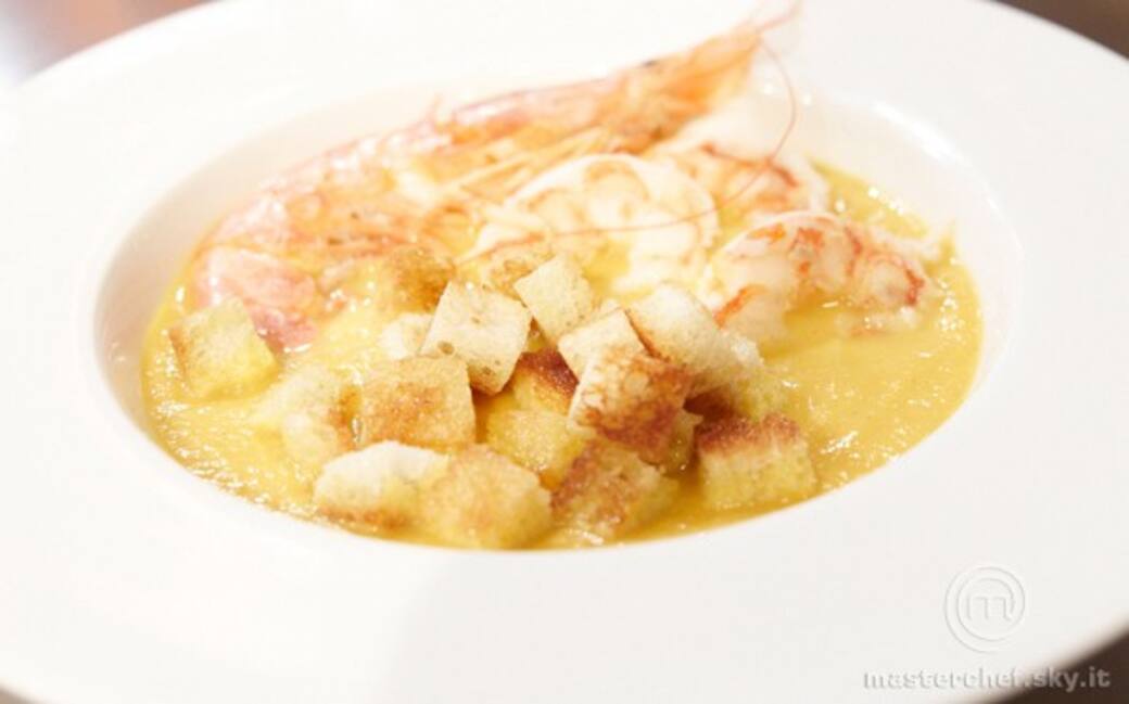 Impiattare in una fondina la zuppa. Adargiarvi sopra i gamberetti e il pane ed infine la polvere di liquirizia.