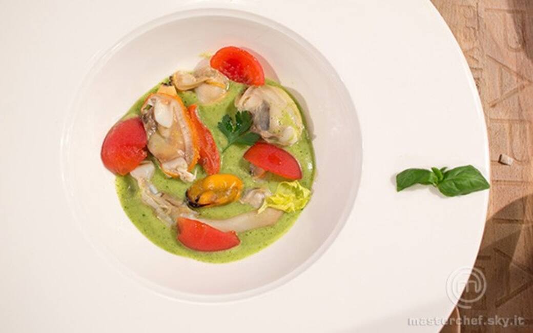 Frullare con un mixer a immersione le zucchine, le patate, il basilico assieme all’acqua di cottura dei molluschi dopo averla filtrata. Infine setacciare la crema per renderla liscia.