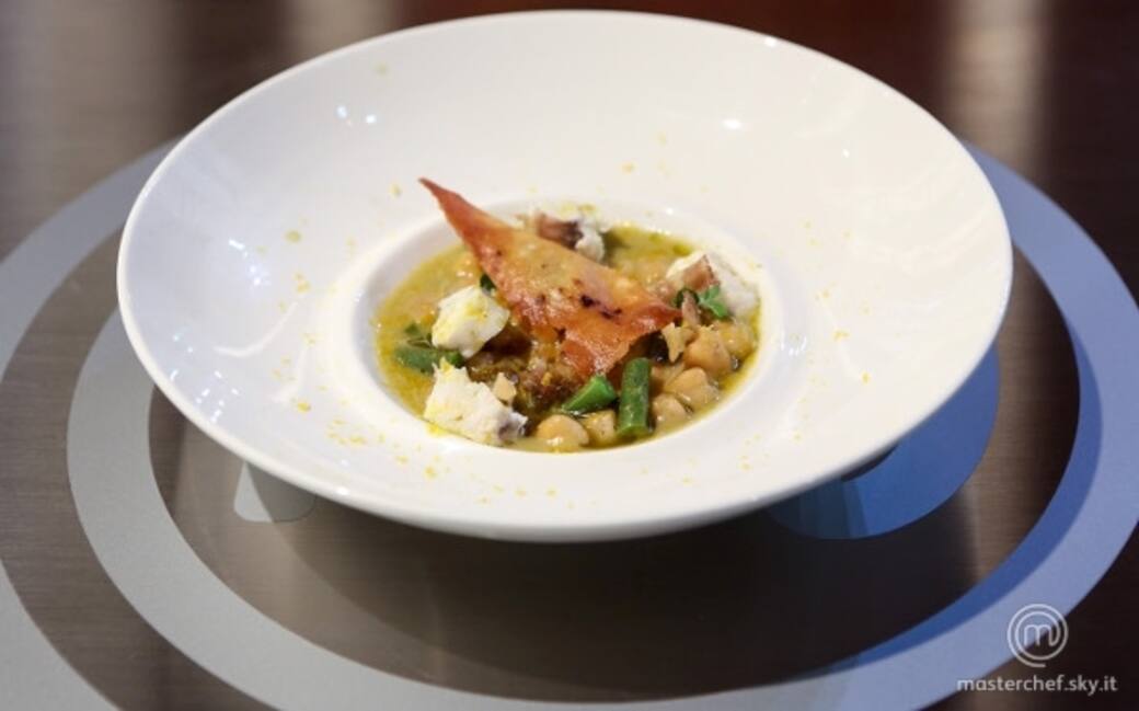 Impiattare ponendo alla base del piatto una noce di formaggio cremoso, la zuppetta di ceci e fagiolini sopra, disporre alternati i pezzetti di pescatrice e lardo croccante, grattuggiare la bottarga, inserire anche la vela di pane guttiau. Rifinire con un filo di olio buono.