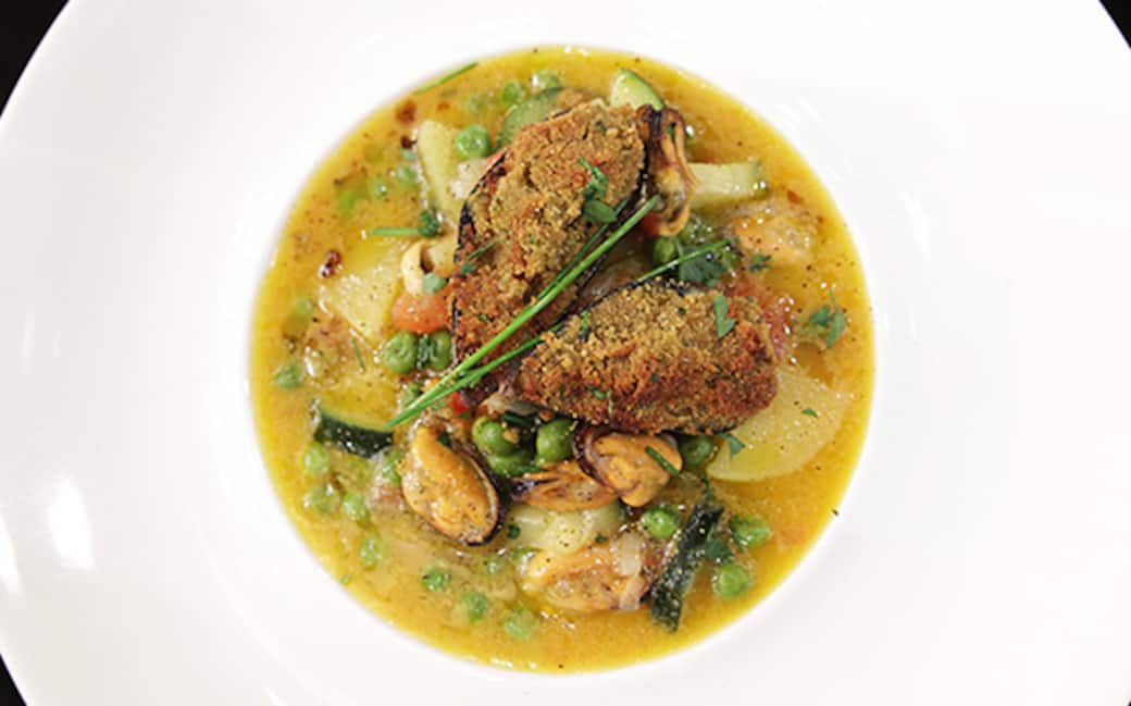 Comporre il piatto in una fondina adagiando sopra la zuppa un paio di cozze gratinate, una spolverata di pepe nero e serviamo.