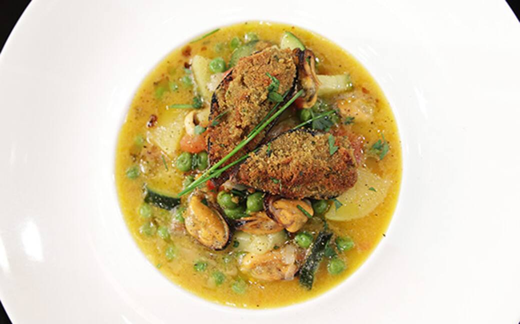 Preparare un composto con il pan grattato, il timo, il rosmarino e del prezzemolo, amalgamare con un po’ d’olio e usare il composto per foderare la cozza. Passare le cozze nel grill facendo dorare la gratinatura.