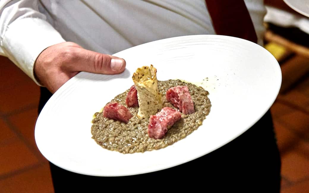 In un piatto da portata a versare la zuppetta di lenticchie, posizionare il pane e il cotechino precedentemente “ripassato” sulla piastra.
