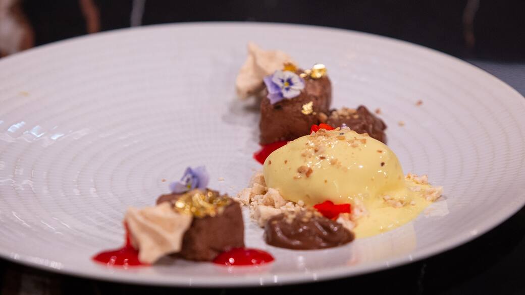 Un dolce bosco - Meringa alle nocciole con gelato al pepe di Sichuan, salsa di lampinu e mousse al cioccolato. Questa è la ricetta proposta da Antonio Lorenzon come dolce del suo menù degustazione.