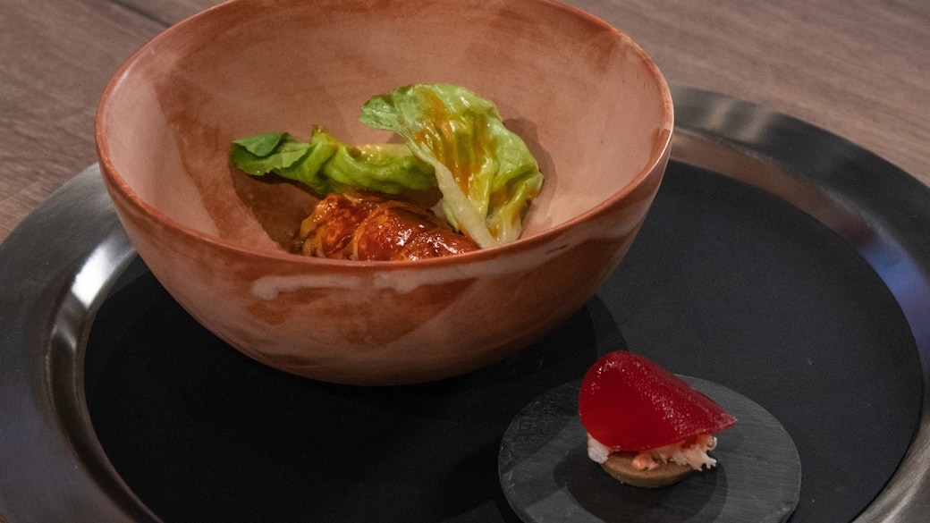 Astice con fagioli, salsa al guanciale e tortino moin-moin con insalata di astice e rapa in infusione di ibisco