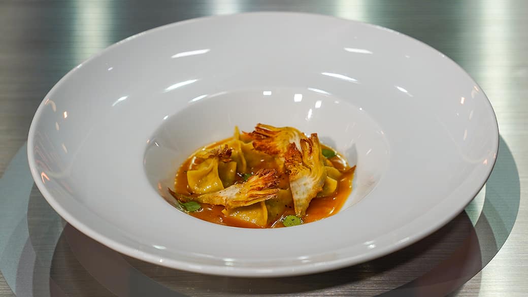 “Il cervello e la pompia”- Ravioli ripieni di cervello, pompia e patate su fondo di pollo con carciofi. Grazie a questo piatto, vince il primo Invention Test
