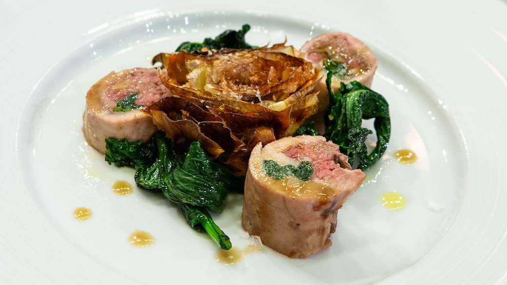 Tagliare il rollè e disporre in ogni piatto 3 pezzi con al centro il carciofo fritto e le foglie di cime di rapa allo zenzero intorno. Condire con fiocchi di sale e servire con la salsa di baccalà e il fondo di cottura