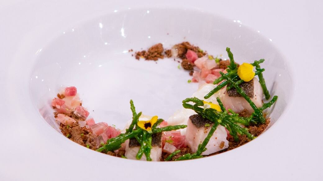 Santorini - Black code con crumble di pane di segale, nervetti sale e limone, salicornia e maionese di lime, cocco e zenzero. Questa è la ricetta proposta da Marisa Maffeo come antipasto del suo menù degustazione.