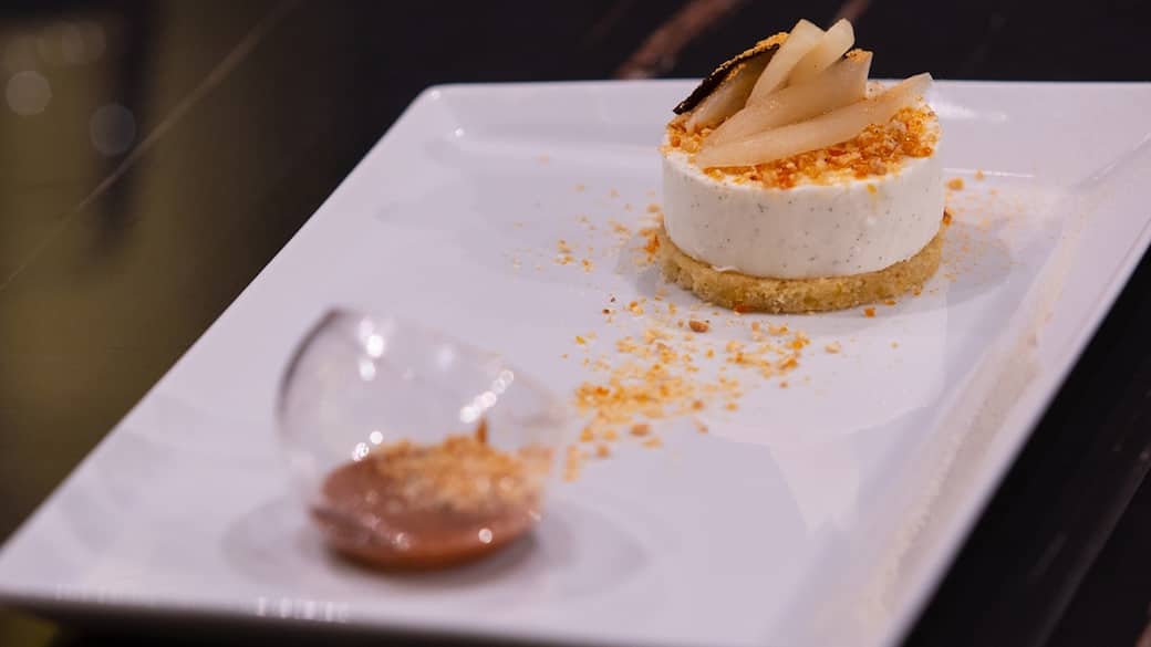 Formaggio e pere - Mousse di caprino alla vaniglia su frolla alle nocciole con pere al rum, cioccolato e caramello salato.
