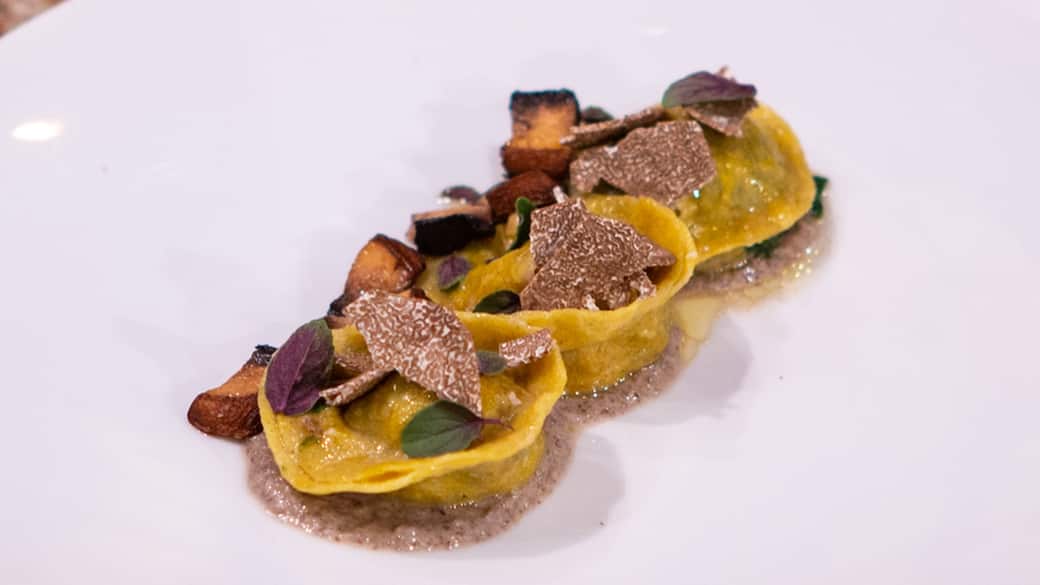 Collina e montagna - Tortelli di grano arso con borragine, ricotta salata e noci tostate su salsa di funghi portobello e kefir con tartufo nero. Questa è la ricetta proposta da Marisa Maffeo come primo del suo menù degustazione.