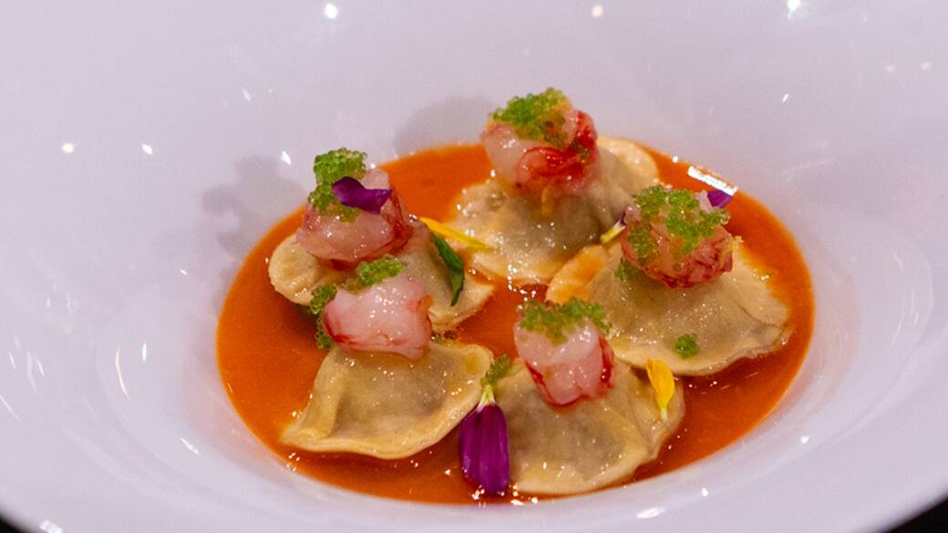 Il Salento verso il Giappone - Ravioli di bombette pugliesi con sashimi di gamberi al cedro e il loro brodetto e tobiko wasabi. Questa è la ricetta proposta da Maria Teresa Ceglia come primo del suo menù degustazione.