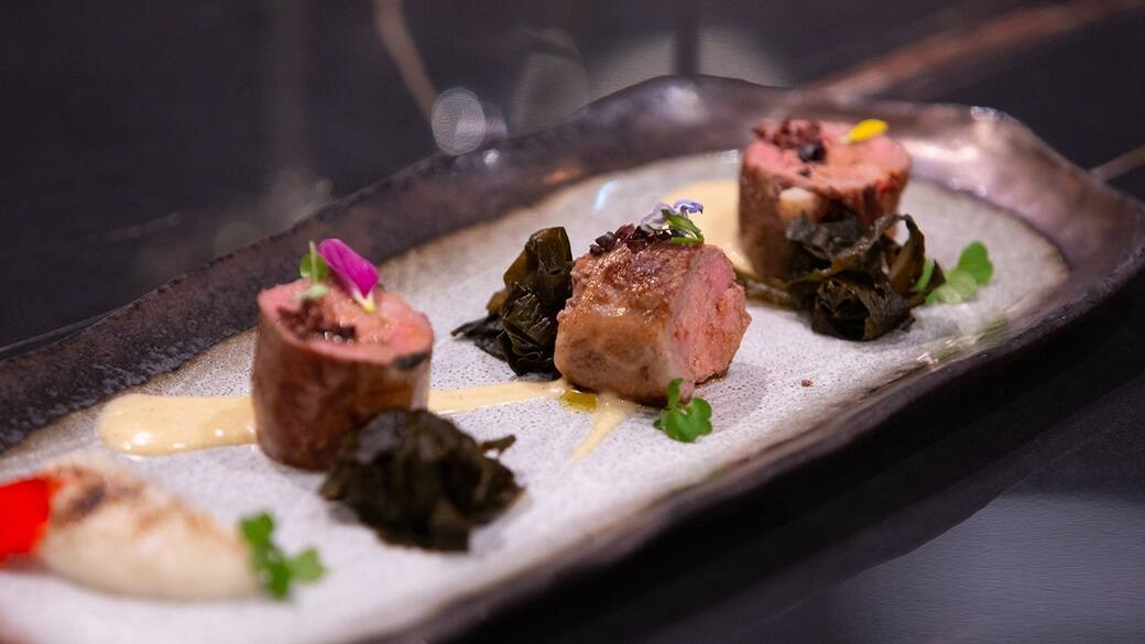 Gargano e Maldive - Torcinello rivisitato con purè di topinambur e liquirizia, salsa di banana alla vaniglia e alga wakame.