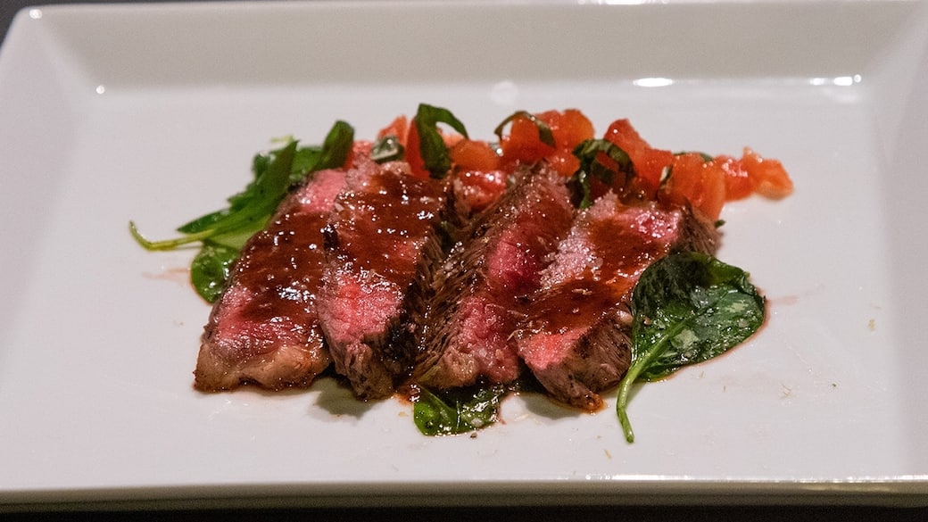 Posizionare al centro del piatto lo spinacino marinato e scolato da eventuale liquido. Adagiarvi sopra le fette di picanha e aggiungere la concassea di pomodori. Ultimare versando del fondo bruno sulla carne. Concludere con sale Maldon.