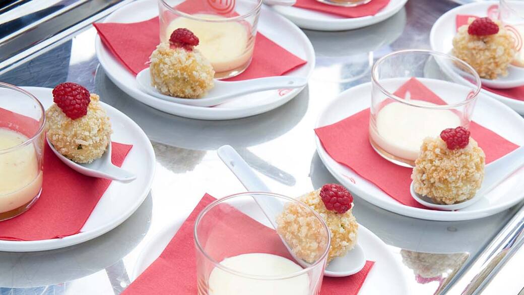 Prendere una coppetta, versare la crema di Castelmagno e qualche goccia di miele. Prendere un cucchiaio monoporzione da servizio, adagiarvi la polpetta e completare con metà lampone.