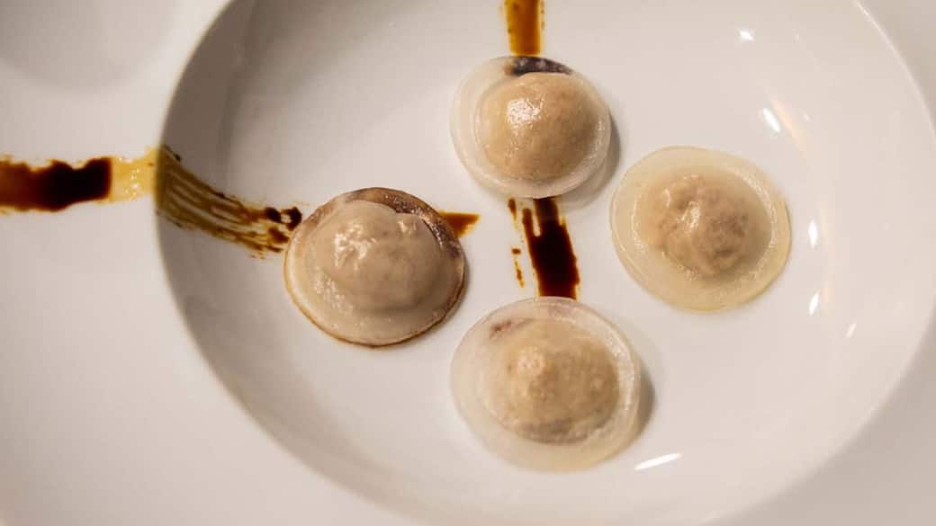 Raviolo al vapore, pollo alla cacciatora e brodo di patate arrosto
