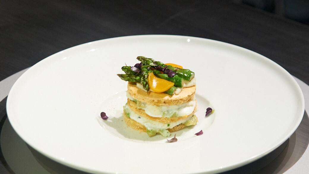 “Ricordi e dipendenze” – Tortino di nocciole e paprika con baccalà, ananas, carote, mousse di ricotta e asparagi