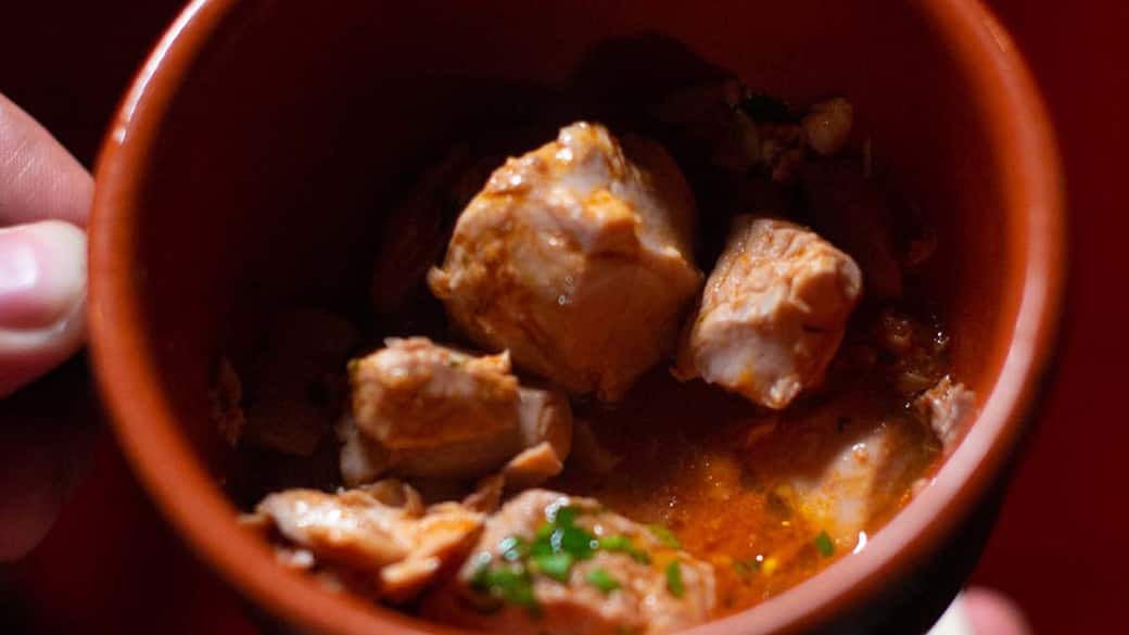 Una volta ultimata la cottura disporre alcuni pezzetti di stoccafisso, mantenendo tutti i condimenti, in un piatto e servire.