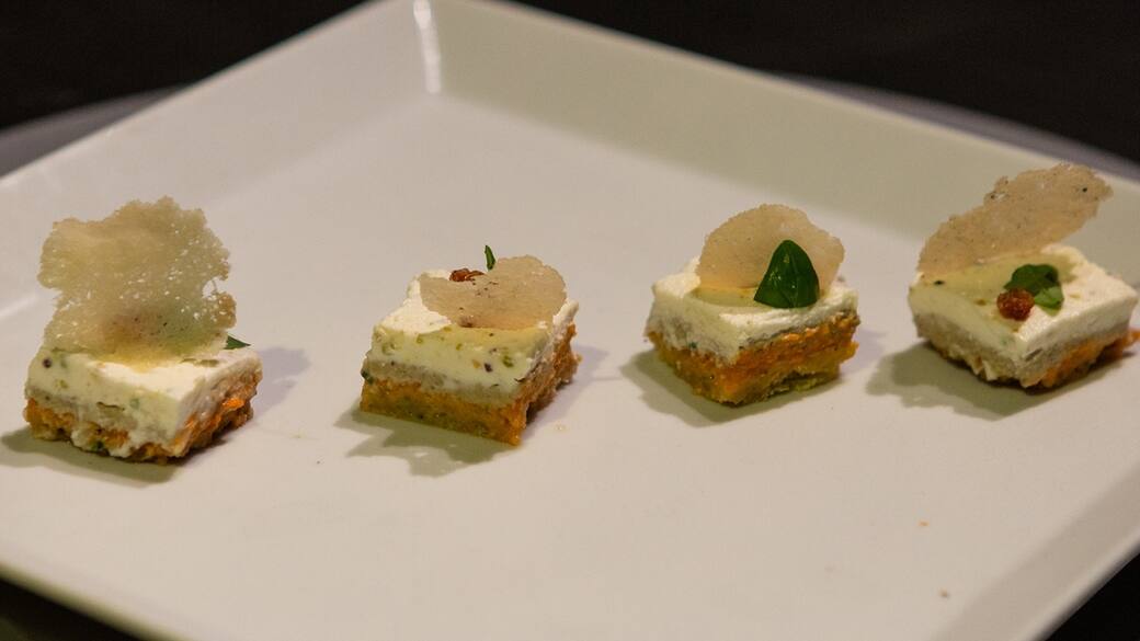Quindici minuti prima del servizio, estrarre dall'abbattitore il composto e far riposare in modo tale che raggiunga la giusta consistenza per poter effettuare un taglio netto e preciso. Consiglio di utilizzare un coltello a lama lunga scaldata con acqua bollente. Ricavare del quadratini di 2 cm x 2 cm e sovrapporne uno sopra l'altro così da creare un parallelepipedo composto da 8 strati, disporne 4 lungo la diagonale e decorare con la cialda di parmigiano, una fogliolina di basilico e un chicco di uvetta. Spolverizzare il piatto con la frolla rimasta tritata.