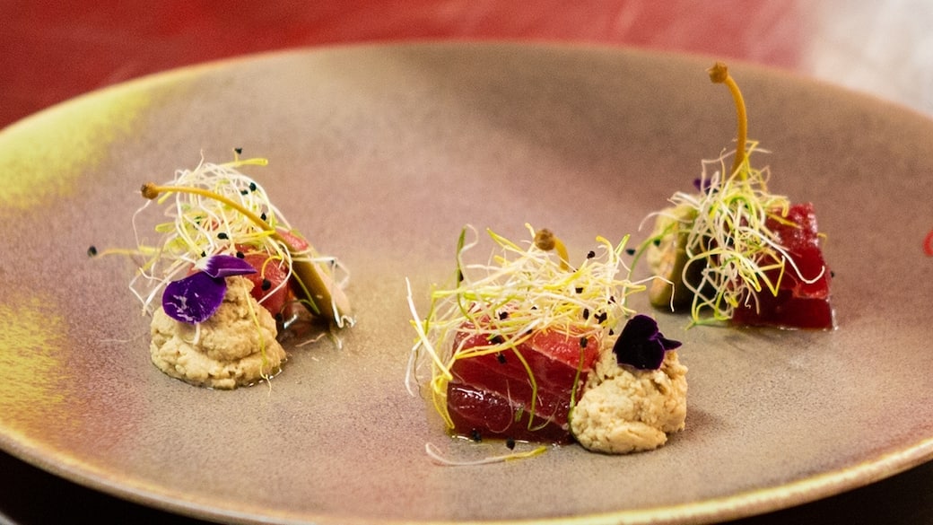 Impiattare disponendo in ogni piatto tre cubi di tonno marinato con a fianco un ciuffo di mousse di vitello, metà di un frutto di cappero e ultimare con qualche germoglio decorativo.