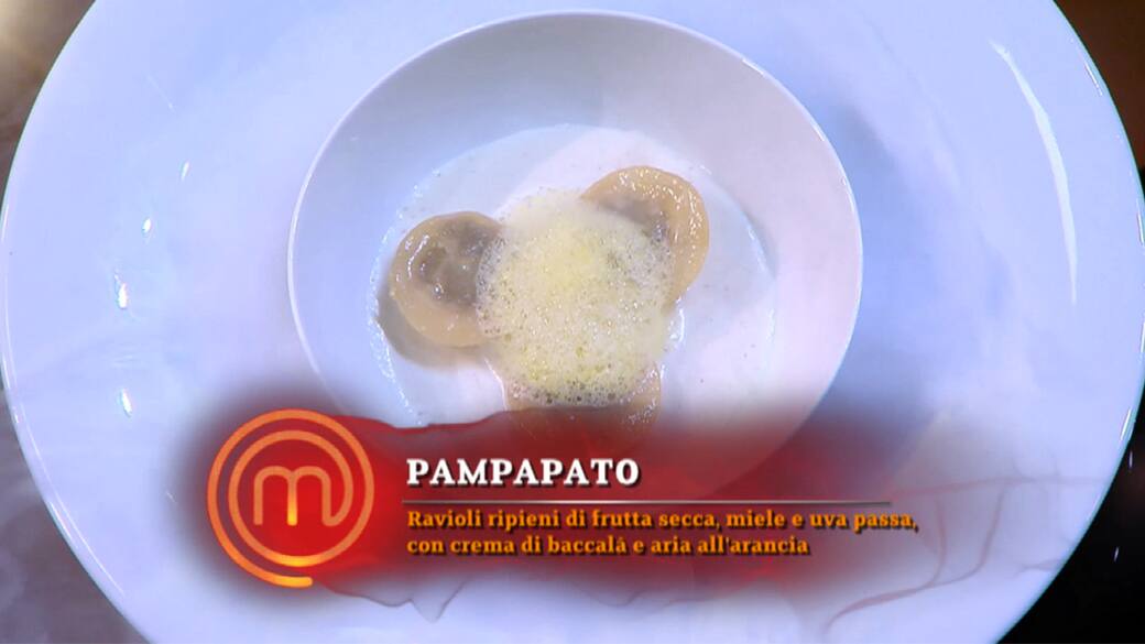 “Pampapato”, ravioli ripieni di frutta secca e uva passa, con crema di baccalà e aria all’arancia è il piatto presentato da Irene, finalista di MasterChef Italia 10